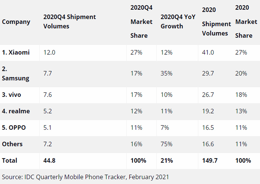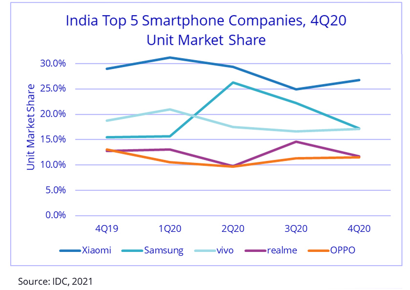 In terms of growth, both Samsung and Xiaomi fared worse in India over the final three months of 2020 than they did a year earlier. They consequently ended up losing the equivalent of four and six percentage points' worth of steam respectively, IDC reports. The market itself declined 1.7% for the first time in years, reaching “only” 150 million units for the entirety of the last year.