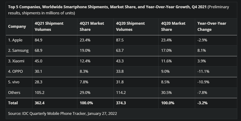 Zeroing on numbers from Q4, 2021, we get a slightly different picture. Apple led the pack with 84.9 million smartphones sold. Samsung, on the other hand, sold only 68.9 million units, followed by Xiaomi, Oppo and Vivo at 45, 30.1 and 28.3 million units, respectively. Apple managed to maintain its market share hegemony despite shipping fewer smartphones compared to 2020. Ryan Reith, group vice president of IDC had the following to say: