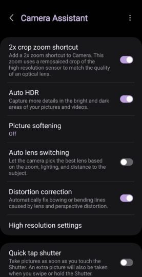 On some flagship Galaxy phones, Camera Assistant can add additional features, like a 2x zoom option to Portrait mode and a regular 2x zoom option that uses in-sensor cropping instead of digital zoom for higher-quality 2x pictures. Last but not least, you have features like distortion correction and the option to make the camera prioritize focus over capture speed (and vice versa).