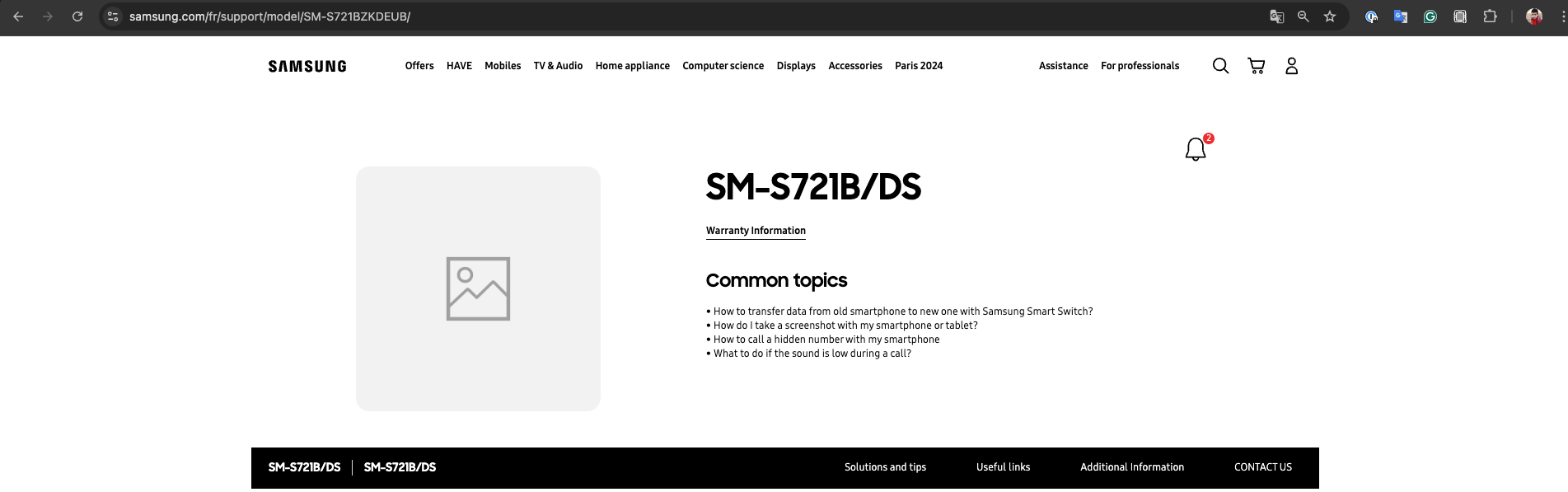 We have spotted a support page for SM-S721B, which is the international variant of the Galaxy S24 FE, on Samsung’s official website for France, as you can see in the screenshot below.