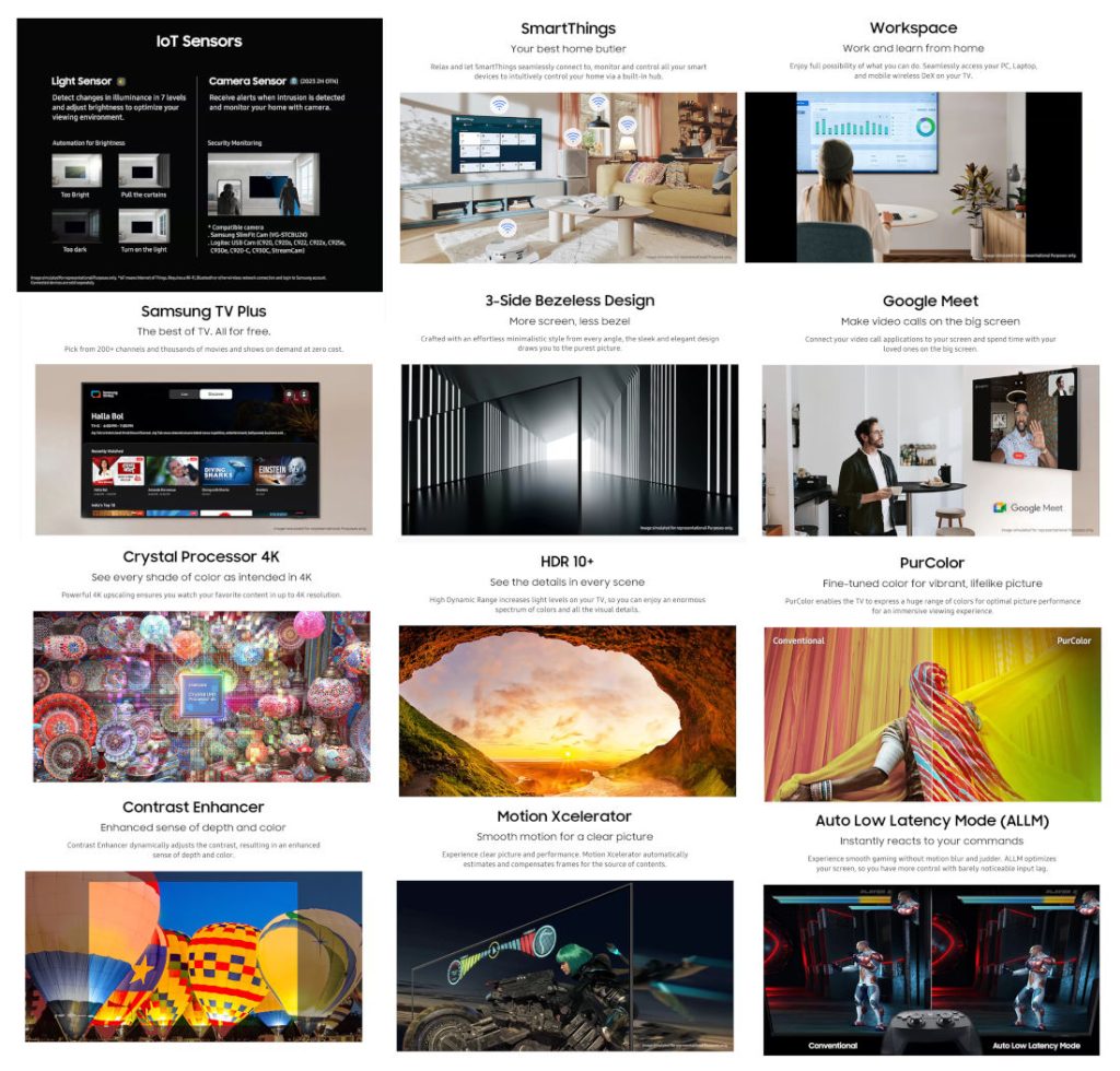 Samsung's Crystal Vision TV is powered by the Crystal UHD Processor 4K chip that can upscale HD content to 4K resolution. Other TV features include ALLM (Auto Low Latency Mode) for improved gaming, Contrast Enhancer, Motion Xcelerator (MEMC), and PurColor.