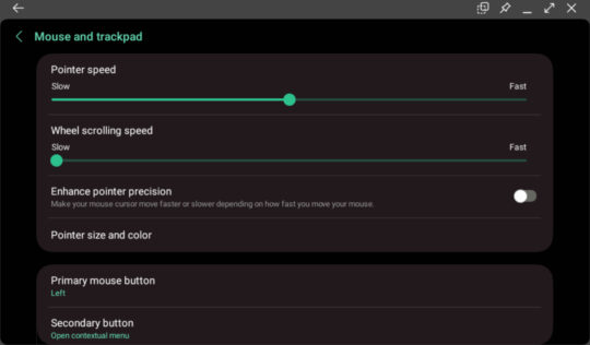 Samsung DeX features relatively robust mouse cursor settings. They allow users to enable or disable mouse acceleration, change the mouse pointer and wheel scrolling speed, and even modify the mouse pointer size and color.