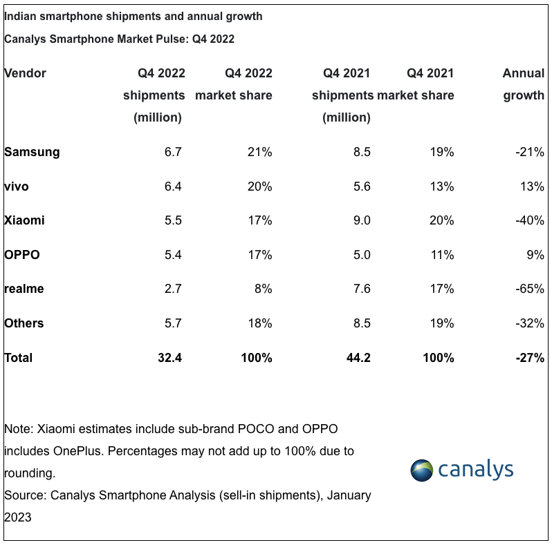 Vivo ranked second with a 20% market share, while Xiaomi ranked third with a 17% market share. OPPO and Realme had 17% and 8% market shares, respectively, in Q4 2022. The whole Indian smartphone market dropped a whopping 27% in the last quarter of 2022 compared to 2021.