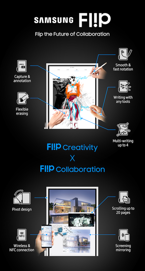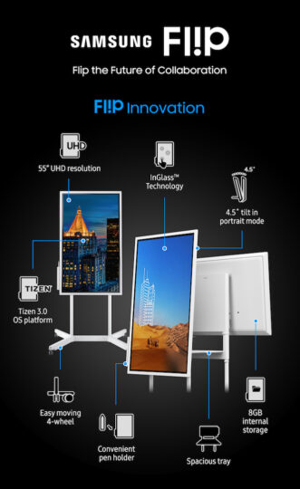 The Samsung Flip supports multi-user engagement and allows up to four different users to introduce content or annotate directly on the UHD resolution screen at the same time using their fingers or a dual-sided pen. The Samsung Flip is powered by the Tizen 3.0 OS platform.