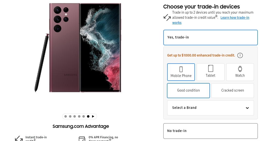 Galaxy S22 buyers in the USA can now save even more when purchasing the latest Samsung flagship through the enhanced trade-in program. Customers can trade up to 2 devices and get up to $700 trade-in credit when purchasing the Galaxy S22 or Galaxy S22+. Samsung offers up to $1,000 enhanced trade-in credit to Galaxy S22 Ultra customers.