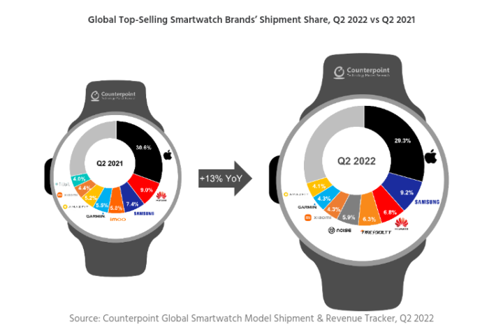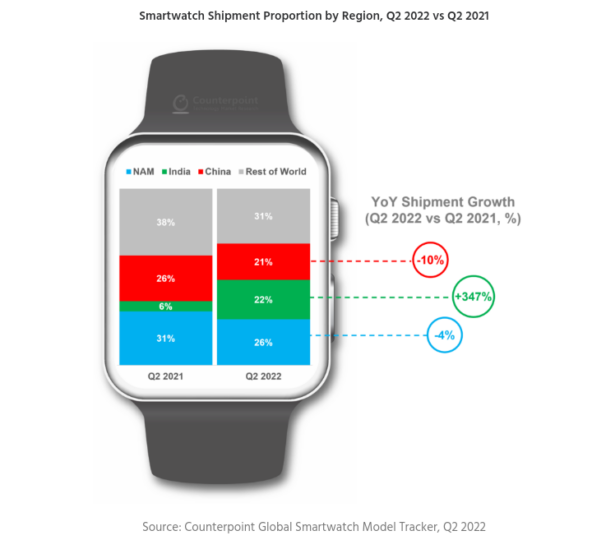 Market watchers say that, by the end of Q2 2022, India's smartwatch market grew roughly 347% year-on-year thanks to local brands such as Noise and Fire-Boltt. India is now the second-largest smartwatch market in the world instead of China, the latter of which declined by around 10% year-on-year due to COVID lockdowns and negative economic growth. (via Counterpoint Research)