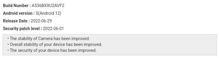 Galaxy A53 5G customers should look for firmware number A536BXXU2AVF2. According to the official changelog, the new update brings the June 2022 security patch and should also improve the overall stability of the phone and the camera.