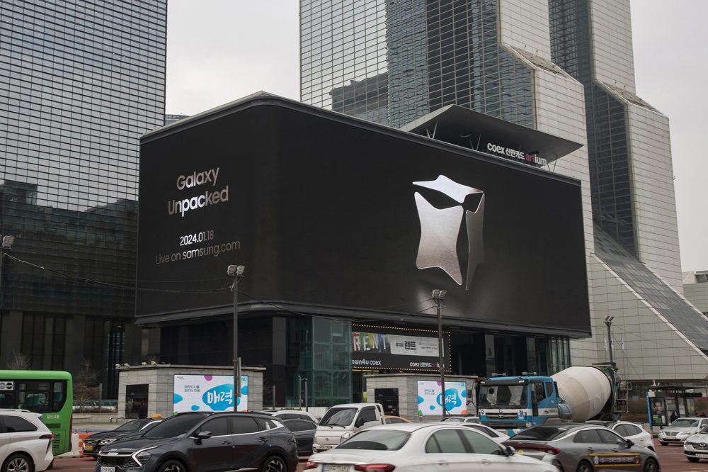 Samsung says the promotional video playing on these digital displays “shows a metallic cube slowly evolving into animated stars that represent Galaxy AI and the transformative experiences it will bring.”
