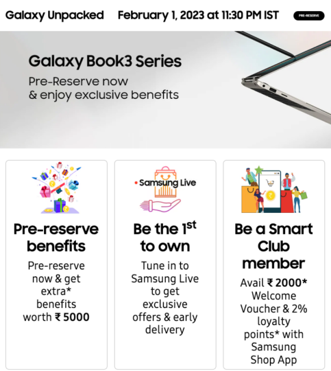 Samsung has opened the pre-reservation of the Galaxy Book 3 in India through the company’s official website for the country. The pre-reservation page for the Galaxy Book 3 for India also mentions that the upcoming laptops from the company will be available for pre-reservation, and therefore, for sale, through Amazon and Flipkart.