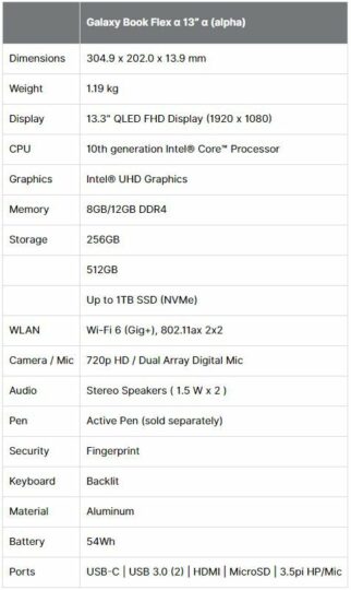 The Galaxy Book Flex alpha comes in one size only, namely 13.3 inches. The QLED panel has a resolution of 1920 by 1080, and the whole device weighs only 1.19Kg.