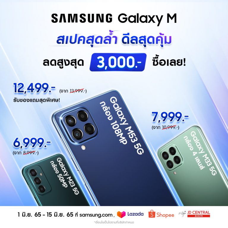 The Galaxy M53 5G in Thailand is launching for 12,999 baht ($379), but customers buying the device before June 15 get a 500 baht ($15) discount along with one free year of Samsung Care+ worth 1,399 baht ($40), and a 25W super-fast wall charger worth 990 baht ($29).