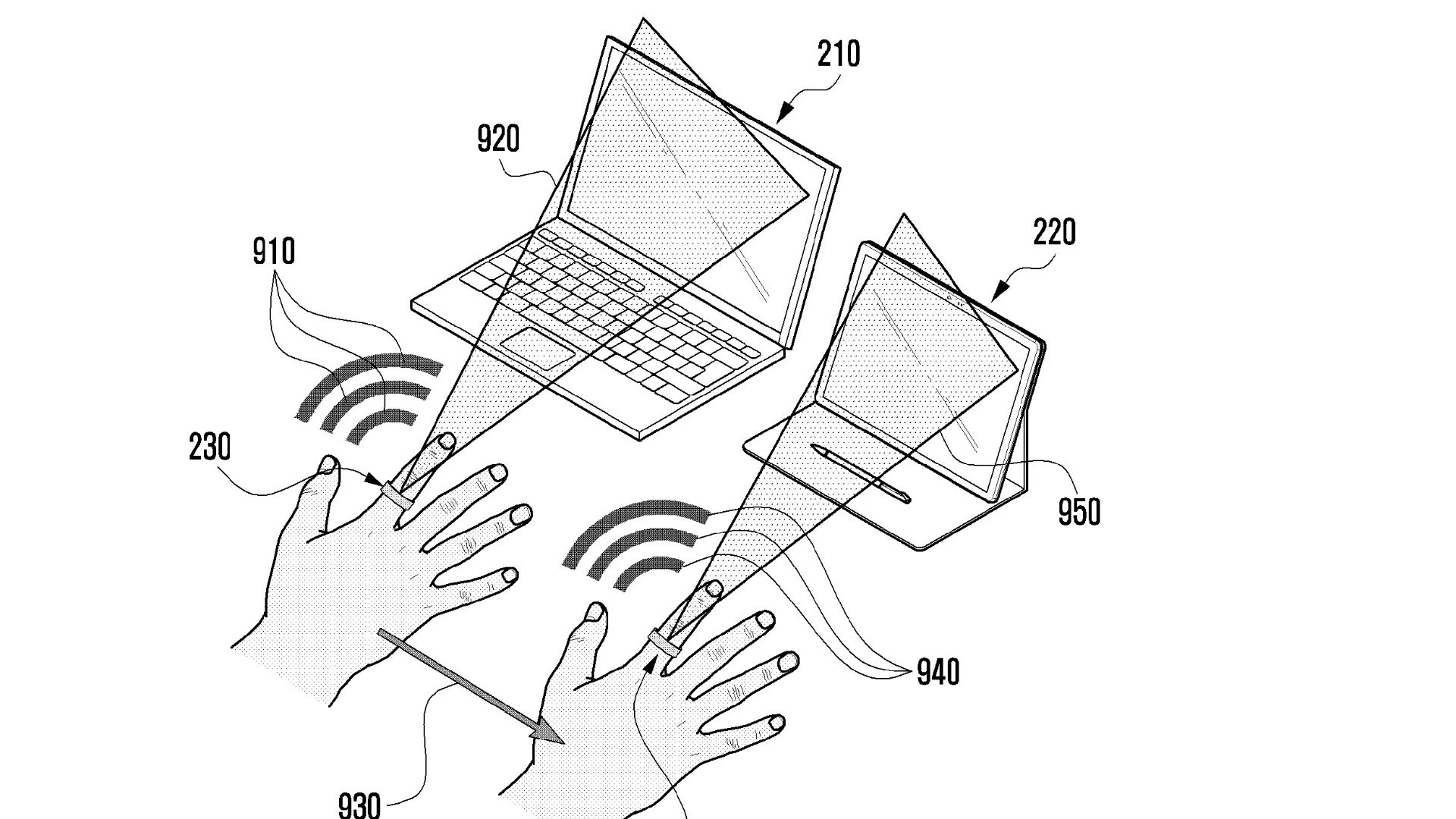 As the images below explain, Samsung's patent talks about controlling the UI and transferring files between connected devices like a Galaxy Book laptop and a Galaxy tablet using a wearable device like the Galaxy Ring. You might be able to pick files from one device (using finger or hand gestures), drag them virtually, and drop them to another device.
