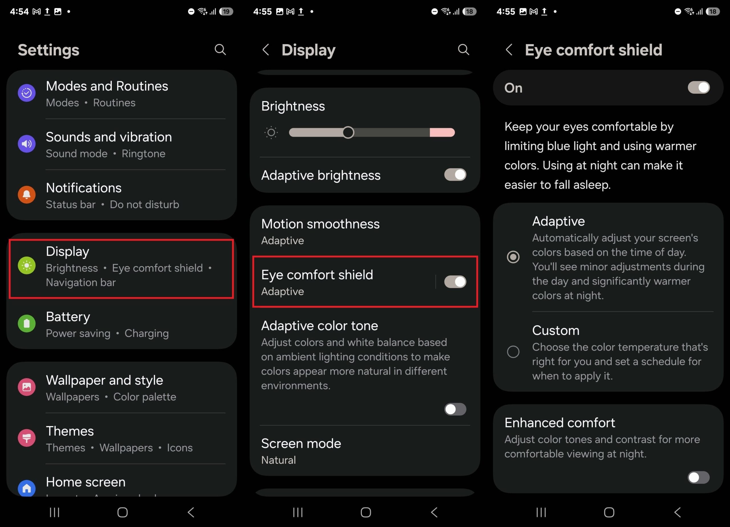 You can enable the Adaptive option to have the phone automatically adjust colors depending on the time of day or choose a custom color temperature (you can also set a schedule for this). There is also a feature called Enhanced comfort that further adjusts color tones and contrast for comfortable viewing at night.