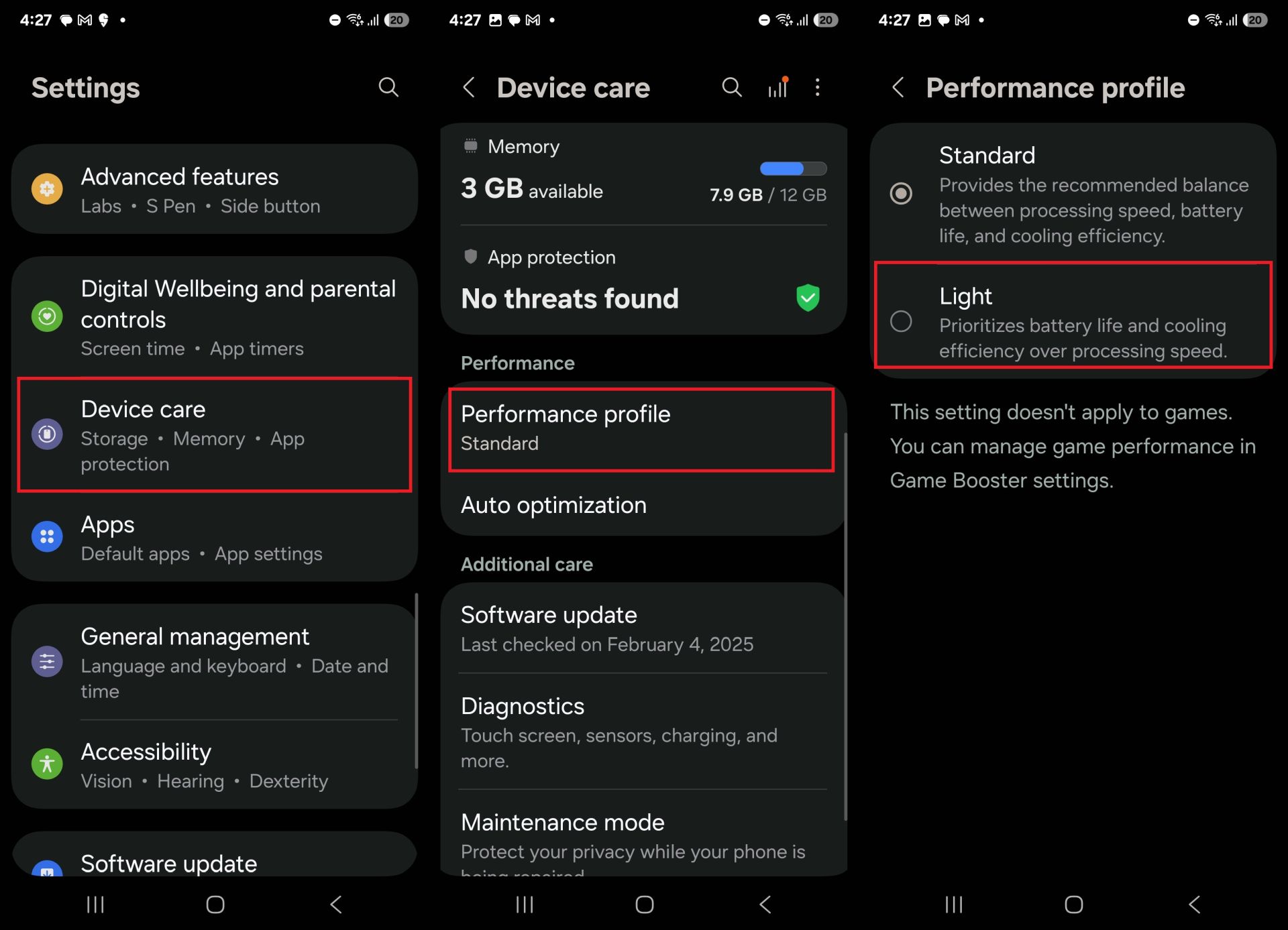 The lighter performance profile focuses on maximizing battery life and keeping the phone cool unless you're playing a game. To enable it, head into the Settings » Device care menu, scroll down and tap Performance profile, and select Light.