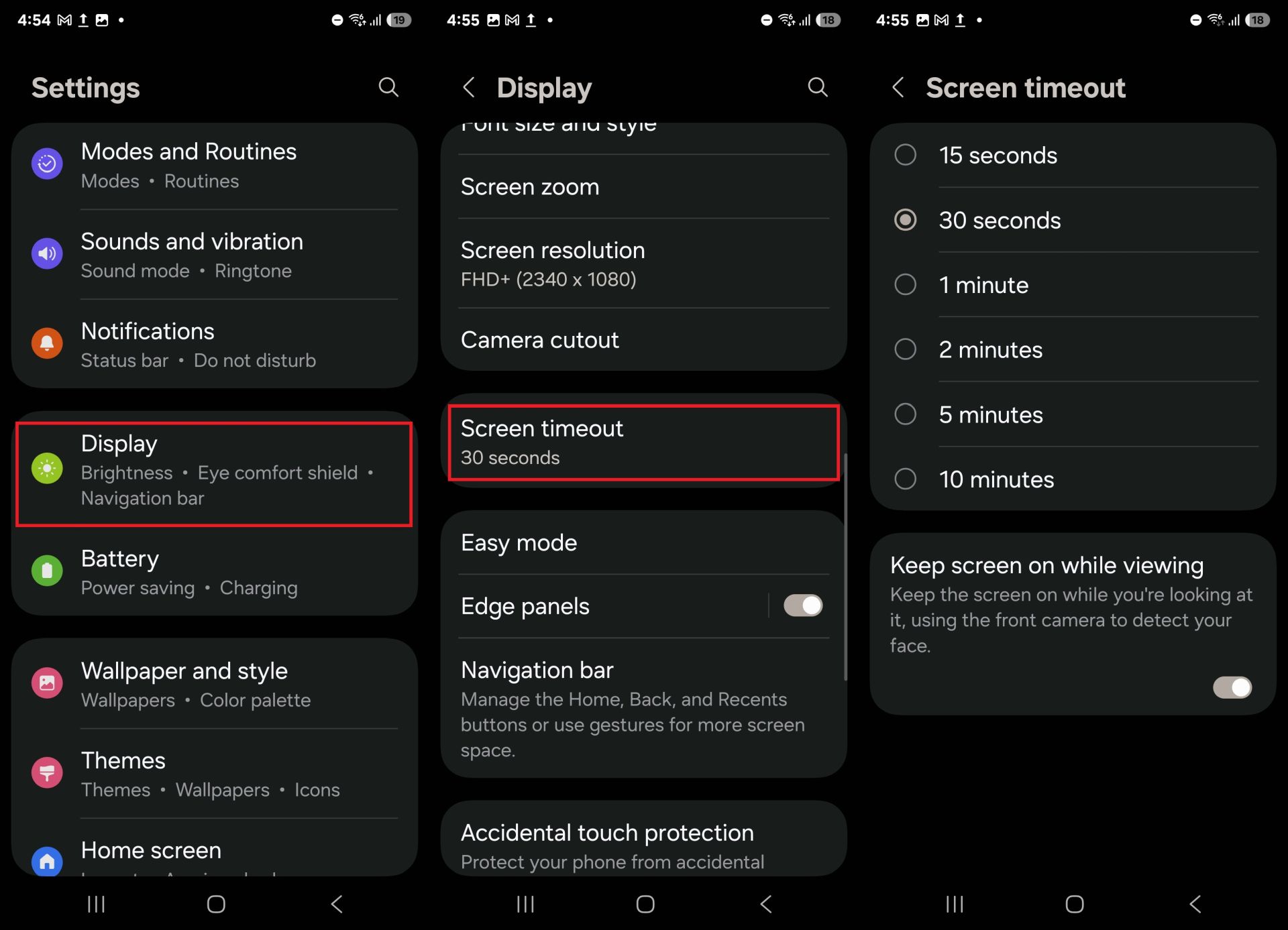 By default, the screen on your Galaxy S25 will turn off after 30 seconds of inactivity. You can change that from the Settings » Display » Screen timeout menu. Better yet, you can have the phone keep the screen turned on as long as you're looking at it by enabling the Keep screen on while viewing option.
