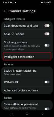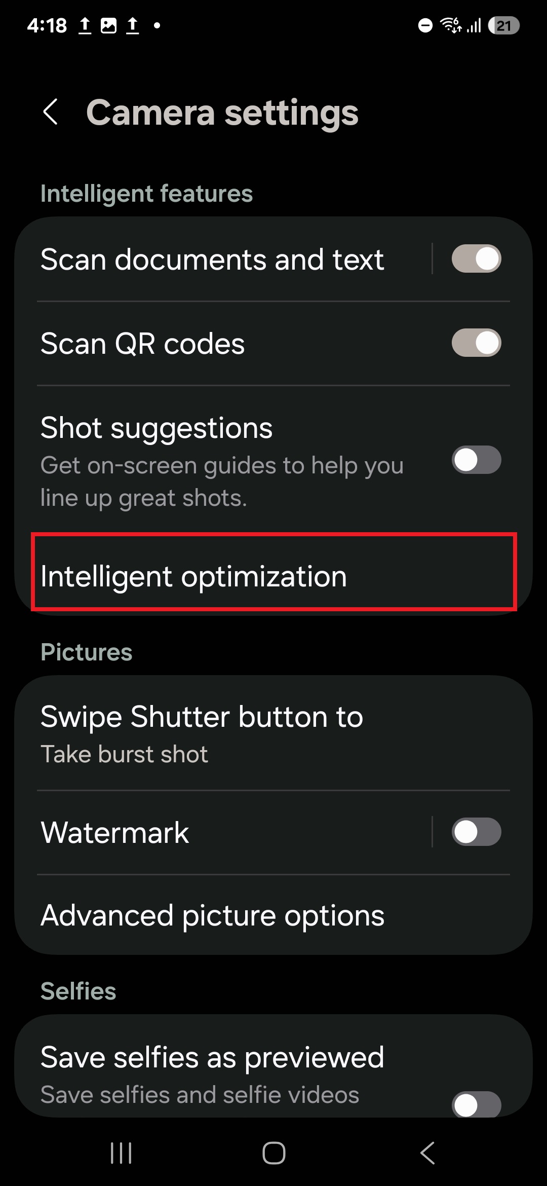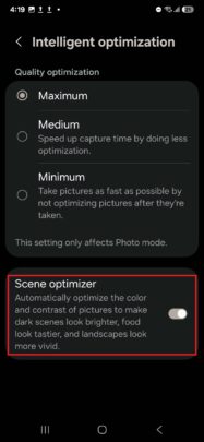 In the Intelligent optimization submenu in the camera settings sits Scene Optimizer, a feature that intelligently enhances colors and contrast of pictures depending on the subject. It doesn't always make noticeable improvements, but it doesn't ruin your photos either so it's best to have it turned on.