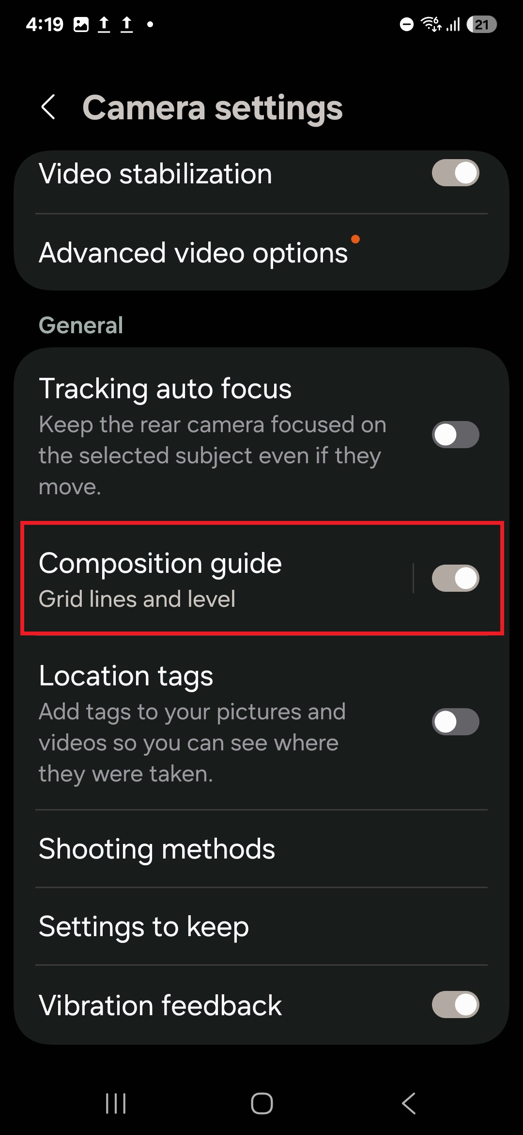 The Composition guide feature helps you line up objects using a 9×9 grid that's overlaid on the viewfinder. It also helps you make sure the subject is not skewed or slanted with the level function. You can find the grid and level options in the camera settings' Composition guide menu.