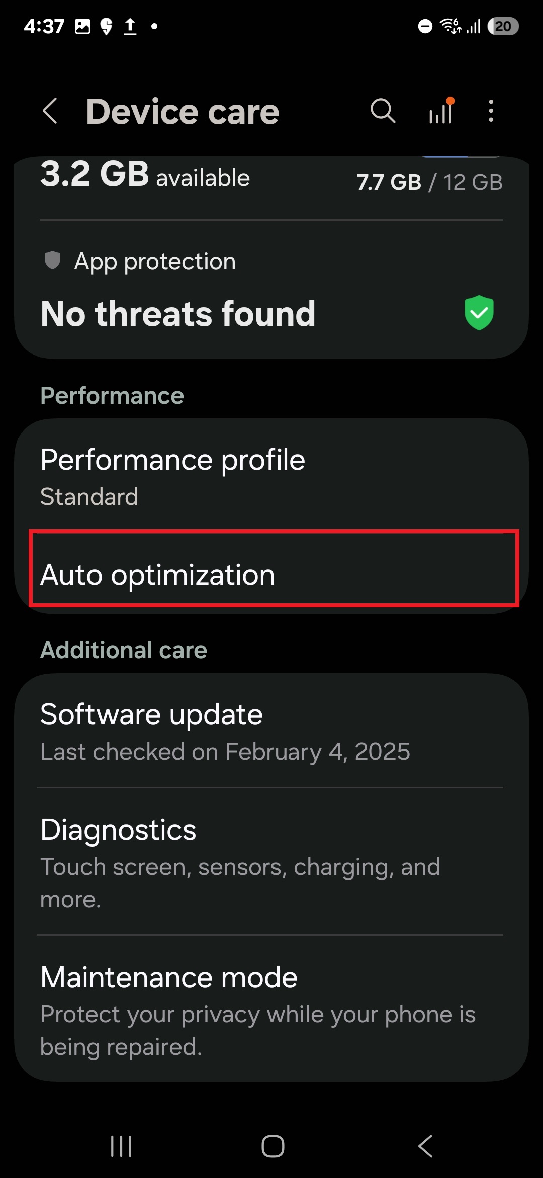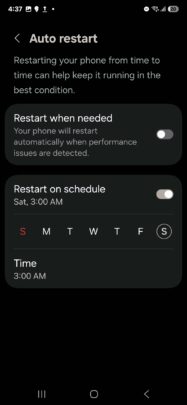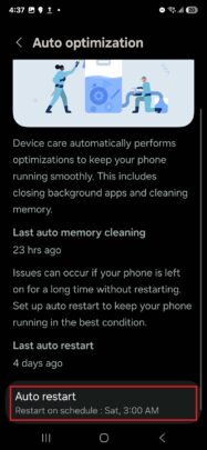 Like PCs, smartphones can show signs of slowdown after a few days of continuous use. To address that, Samsung offers the Auto restart setting. You can find it in the Settings » Device care » Auto optimization menu and have two options: let the phone restart automatically when it detects performance issues or set a custom schedule.