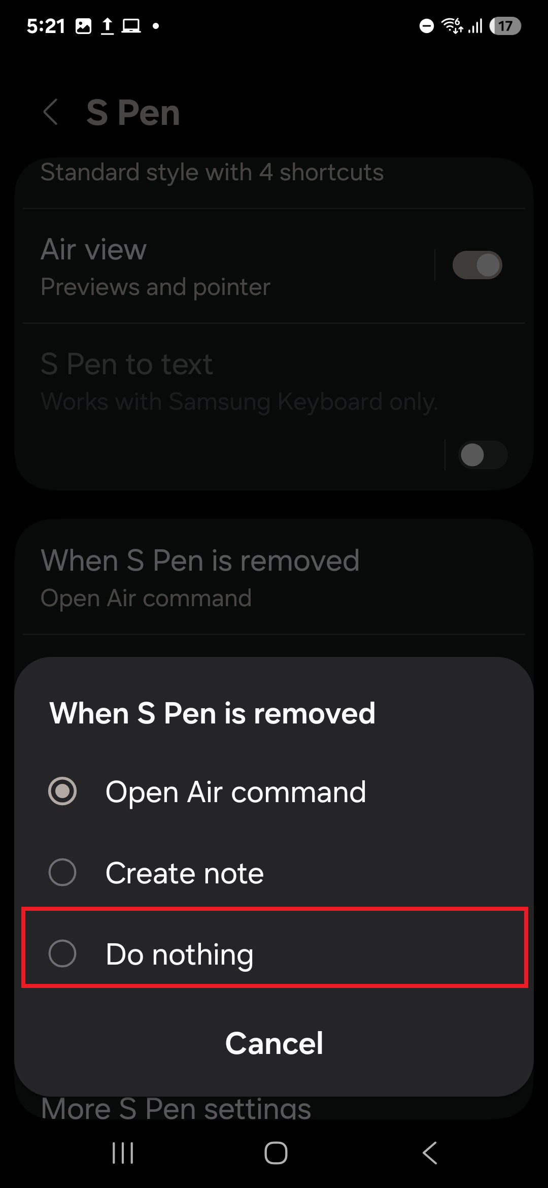 The Air Command menu appears every time you take the stylus out, but you can disable that behavior if it irritates you. To do that, head back into the S Pen settings, tap When S Pen is removed, and select the Do nothing option.
