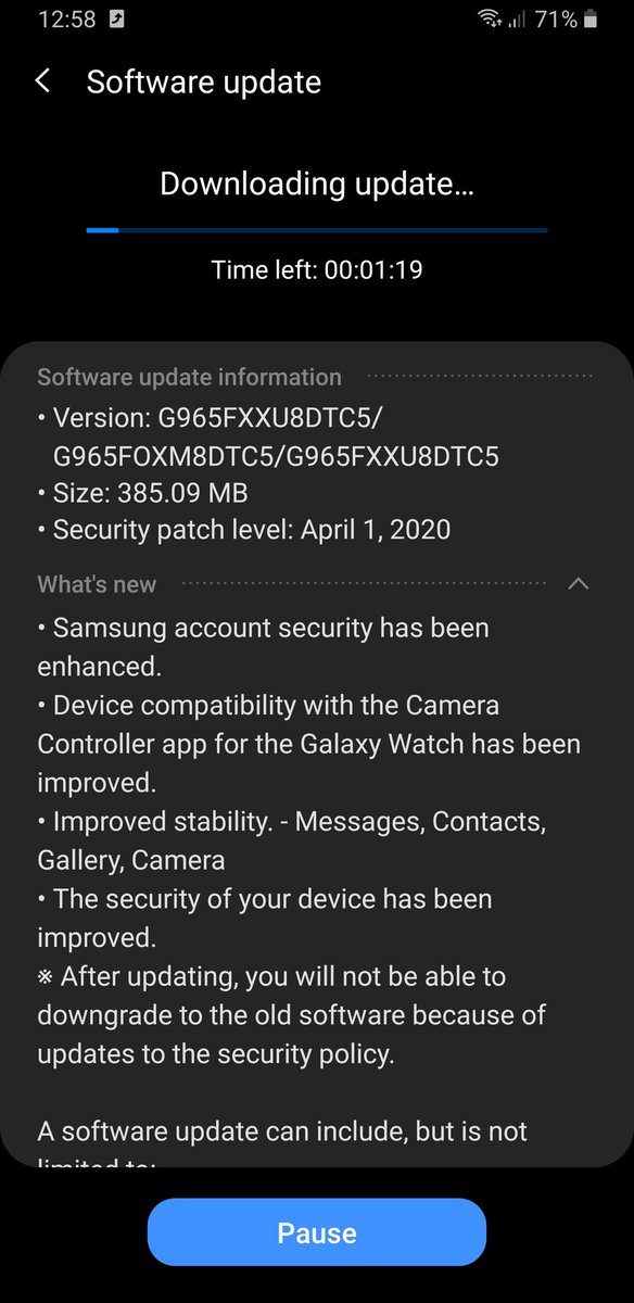 According to the changelog, the update enhances security for Samsung accounts, which we're assuming is separate from the mandatory two-factor authentication the Korean giant introduced to its cloud service recently. The update also enhances compatibility of the S9 and S9+ with the Camera Controller app for the Galaxy Watch. The Camera Controller app lets you control the phone's camera on compatible Galaxy smartwatches, and if you haven't already been using it, you can download it here (open the link on your phone to be taken directly to the Galaxy Store).