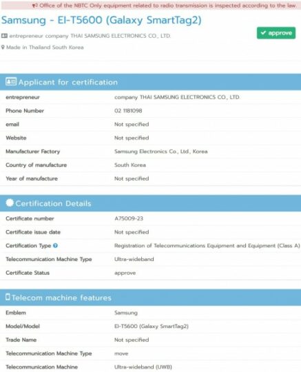 According to the NBTC certification (via GSMArena), the Galaxy SmartTag 2 carries model number EI-T5600, which is the same model number that was mentioned in the FCC certification documents. The latest certification also reveals that the Galaxy SmartTag 2 features UWB (Ultra-Wideband) connectivity, just like its Bluetooth SIG and FCC certifications had revealed.