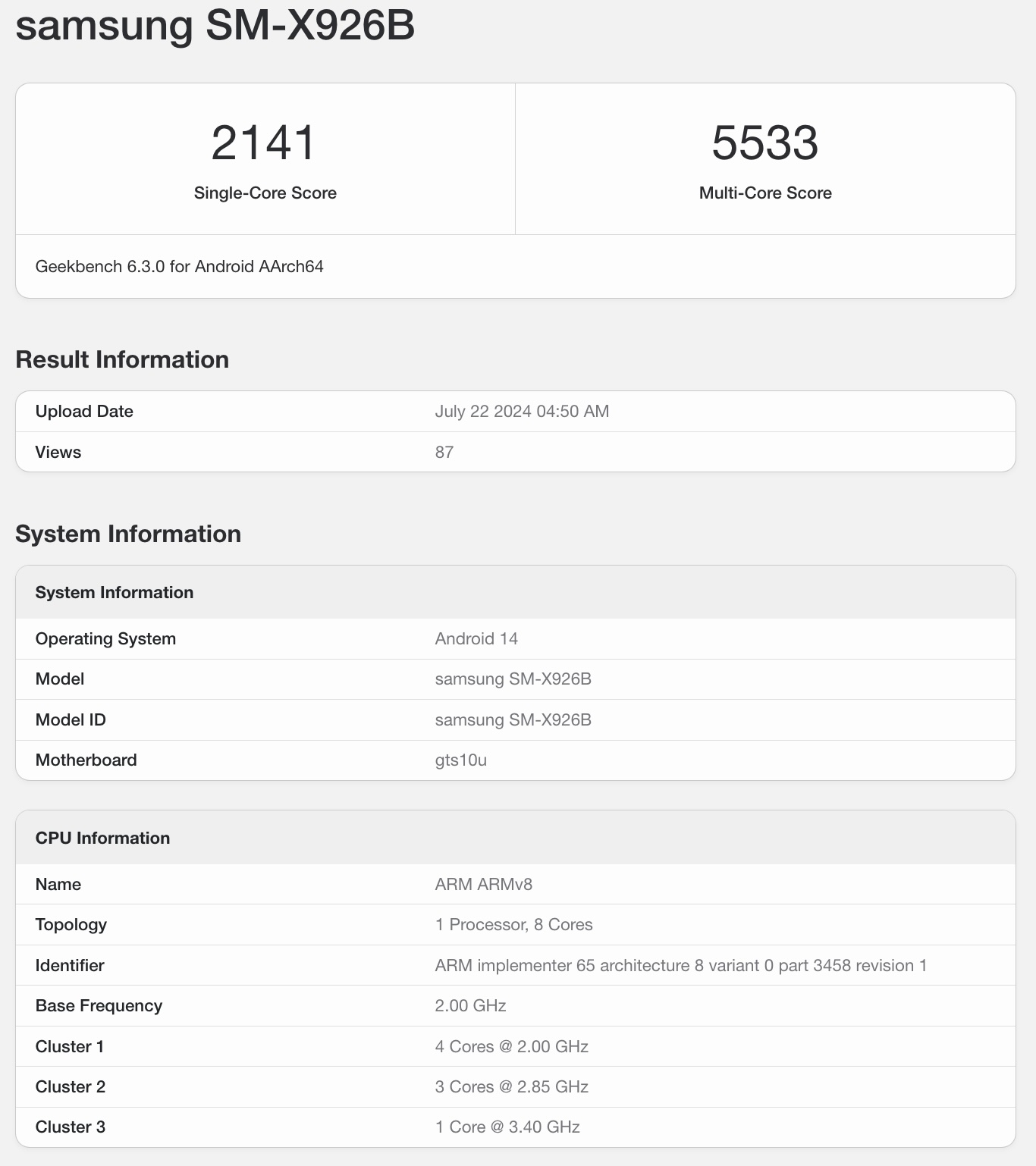 The Dimensity 9300+ has an octa-core CPU with one Cortex-X4 core clocked at 3.4GHz, three Cortex-X4 cores clocked at 2.85GHz, and four Cortex-A720 cores running at 2GHz. The new entry also shows the Galaxy Tab S10+ featuring Android 14 and 12GB RAM. The tablet scores 2,141 points in Geekbench's 6.3.0 single-core test and 5,533 points in the multi-core test.