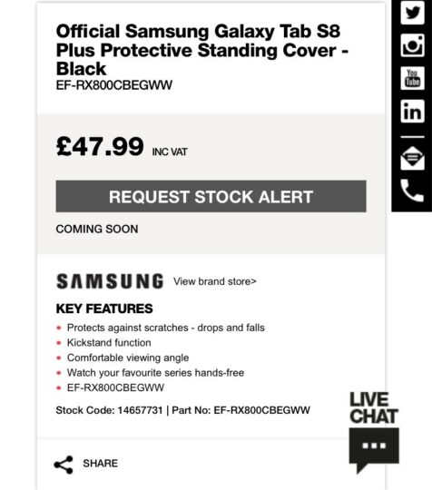 UK retailer Box has published pages for Galaxy Tab S8 series accessories along with their model numbers and prices, which was spotted by tipster @chunvn8888. However, this pricing could be tentative. The Galaxy Tab S8, Galaxy Tab S8+, and the Galaxy Tab S8 Ultra will have a Protective Standing Cover case. The Galaxy Tab S8 Ultra will also have the Book Cover and the Book Cover Keyboard.