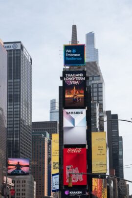 These billboards started displaying Samsung's advertisements on June 26, 2024. They are now visible at prominent places in Bangkok, Brasília, Dubai, Ho Chi Minh City, London, Madrid, New York, Seoul, Tokyo, and Warsaw. It shows a rotating cube, the Eiffel Tower, and the four-star Galaxy AI logo. Similar advertisements will appear in other cities as well.