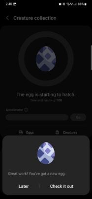 Once you select an egg, you'll see a timer, a progress bar around the egg, and an accelerator. Using the accelerator helps you hatch eggs faster. You can earn accelerator points by simply playing games through the Game Launcher.