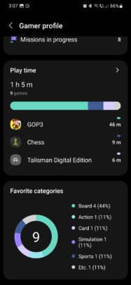 The Gamer Profile in Game Launcher has several functions, including a progress breakdown of the egg-hatching mini-game and information about your play time and favorite categories of games.