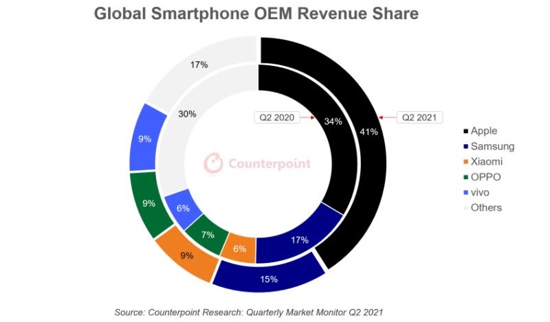 As far as revenue shares are concerned, Apple had a whopping 41% in Q2 2021, whereas Samsung's revenue share declined from 17% in Q2 2020 to 15% a year later. Xiaomi was also able to increase its revenue share from 6% to 9%.