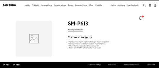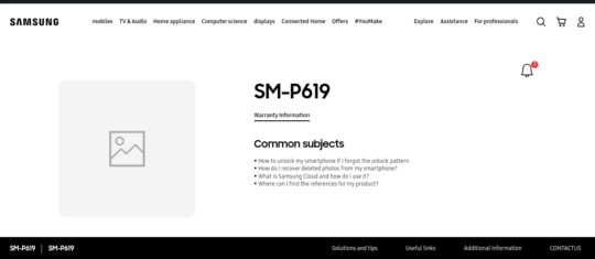 The SM-P613 and SM-P619 model numbers were confirmed by official support pages at Samsung France. The SM-P619 model number is also mentioned at GCF (Global Certification Forum), Bluetooth, and online benchmarks Geebench and HTML5test.