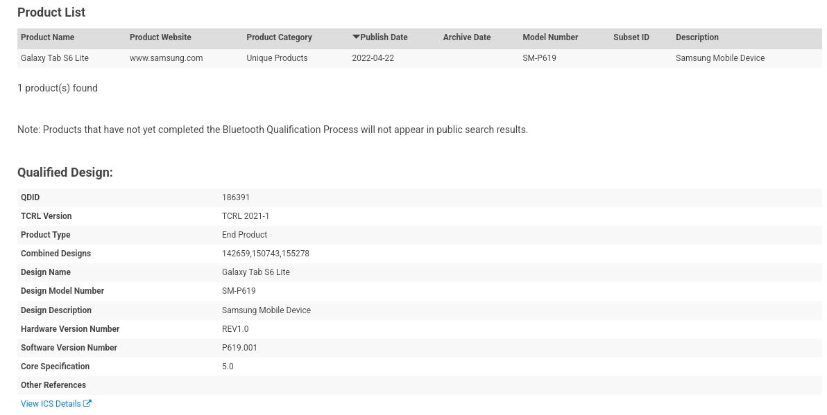 As for the Bluetooth documents, they link the “SM-P619” model number with the “Galaxy Tab S6 Lite” moniker, oddly enough.