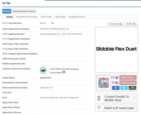 Samsung showcased slidable device concepts at Display Week earlier this year, and one prototype was tentatively called “Slidable Wide.” The new Slidable Flex Duet trademark may be associated with this concept, but it's difficult to predict how Samsung's foldable display portfolio will change and evolve in the coming years. In practical terms, the Slidable Wide prototype featured a flexible display tucked away inside a device that can slide out from its sides to extend the viewing area.