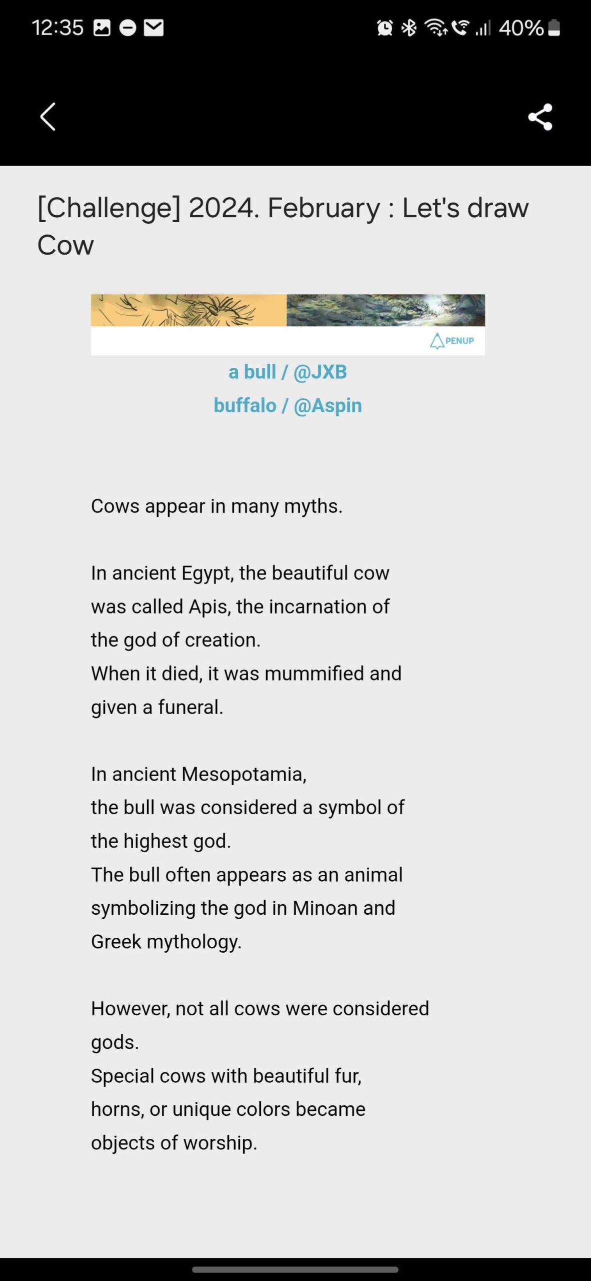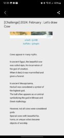 The official description for the PENUP challenge contains lots of interesting fun facts that relate to the theme. Firstly, it reminds us that people have been drawing and painting cows for a long time. In the Neolithic Age, people drew images of bison to pray for success in hunting.