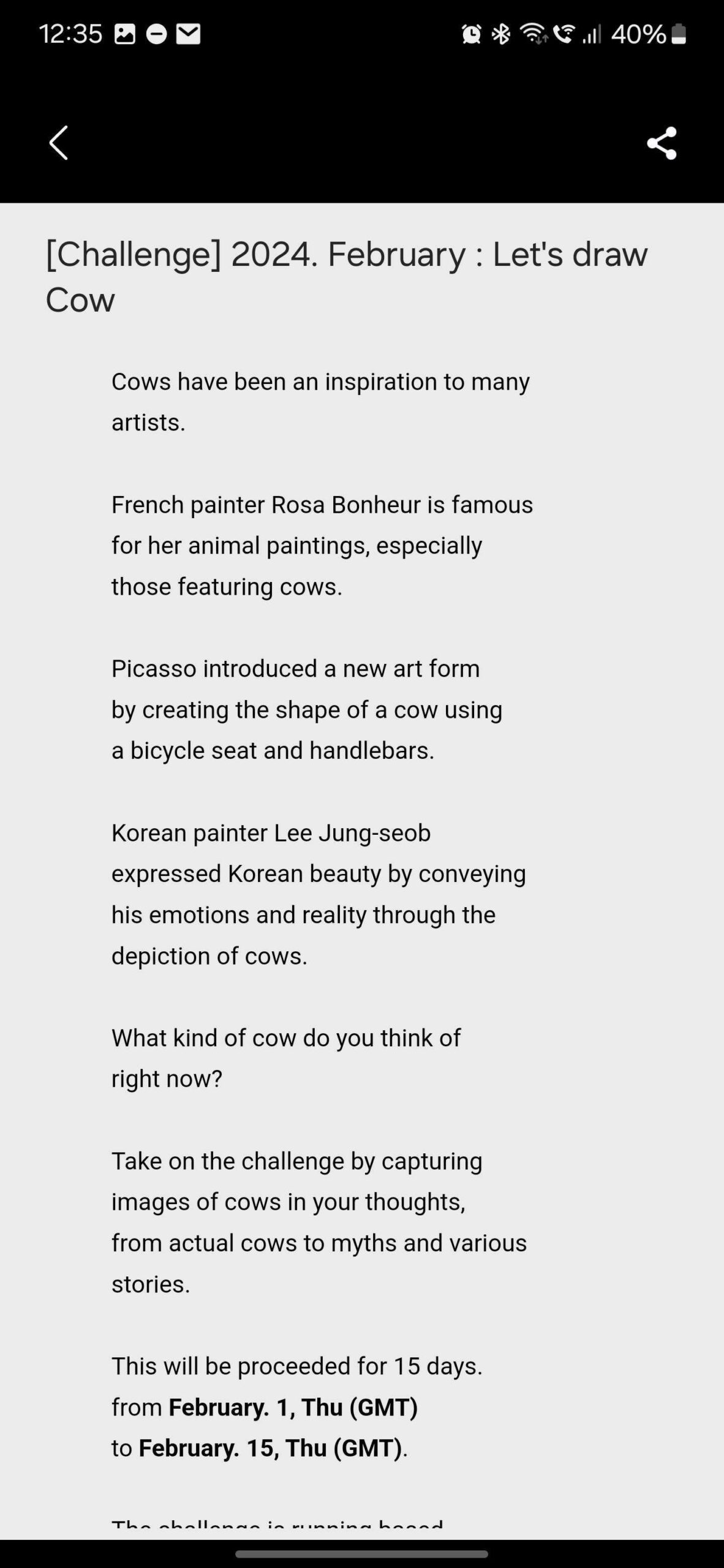 This new drawing challenge is the first for this month and will be replaced in mid-February. The Cow drawing challenge is live until February 15.