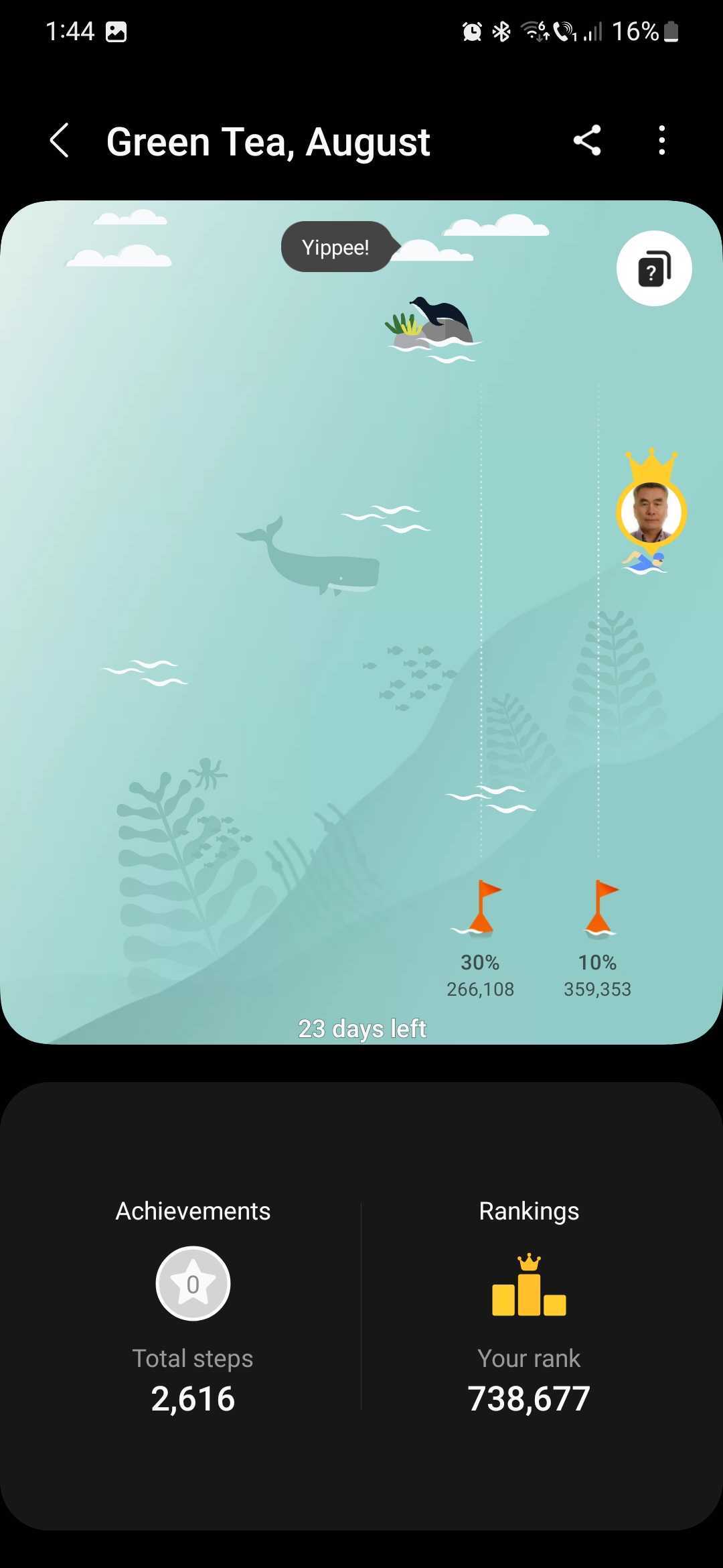 If the Samsung Health user leading the pack in the monthly challenge went past the finish line, you can swipe left on the map screen to see how much further they went. You can also see how many Health users are in the top 10% and 30%.