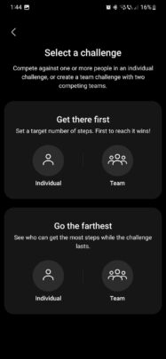 Challenges created by Samsung are the same for every Health user, and they usually change every month. In addition, users can create their own individual or team-based challenges for friends, with winning conditions such as reaching a destination first or going the farthest.