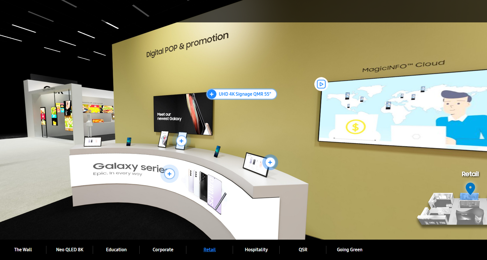 The InfoComm 2021 Samsung VX virtual event is now hosted online by Samsung's Display Solutions division. Visitors can navigate the virtual showroom in 360 degrees and learn more about display products ranging from The Wall to brand-new signages based on Neo QLED 8K technology and other outdoor display solutions that boast dust and water resistance.