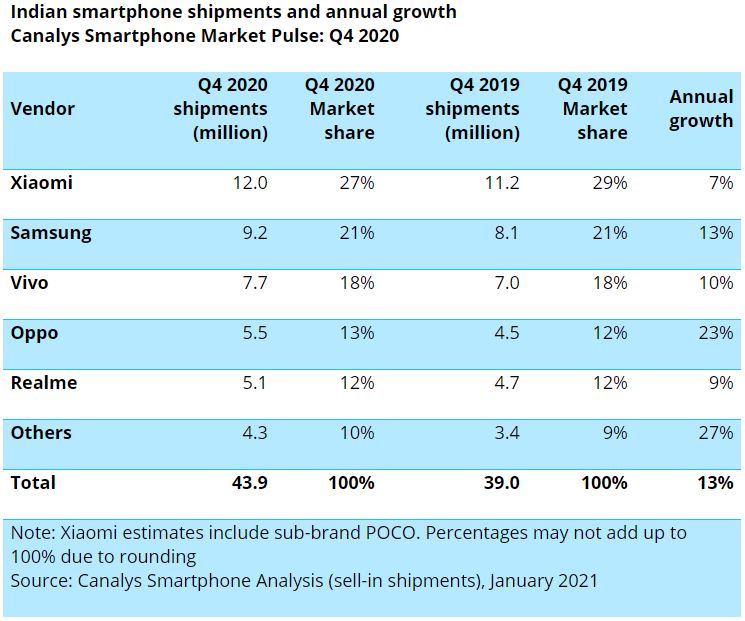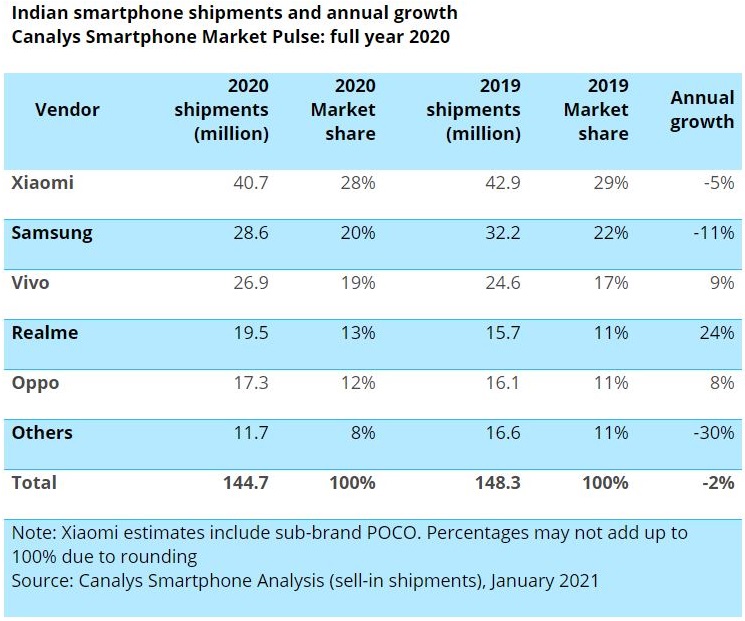 According to market research firm Canalys, Samsung experienced a 11% decline throughout 2020 and its market share at the end of the year stood at 20%, down from 22%. Back in 2019, Samsung was able to ship 32.2 million smartphones to India, but in 2020 that figure dropped down to 28.6 million. Xiaomi, who continues to lead the Indian smartphone market, also experienced a 5% decline and fewer shipments by about 2 million.