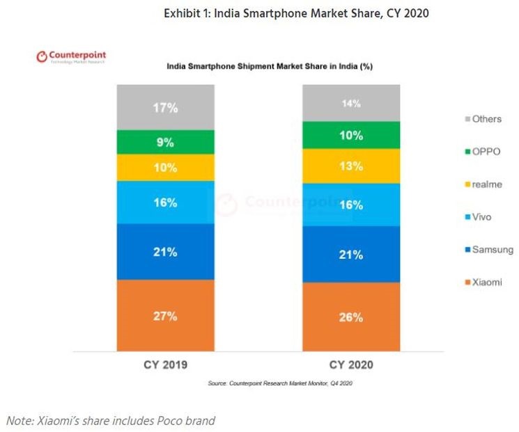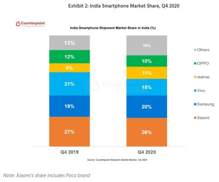 All the major OEMs combined have reportedly shipped 144.7 million smartphones to India throughout 2020, which represents only a 2% year-on-year decrease from the 148 million shipments recorded in 2019. The exact figures aren't clear though, as Counterpoint Research estimates a 4% YoY decline. Either way, both market watchers agree that Samsung India had a decent year and won the silver medal.