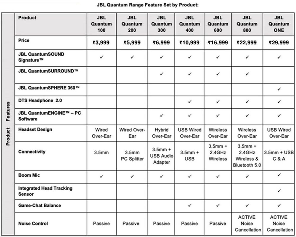 At the opposite end of the spectrum you will find the JBL Quantum 100 for INR 3,999 ($52). This model lacks ANC, DTS 2.0, and other JBL-specific sound features. You can refer to the list below for more specs and price details for every one the new JBL Quantum headphones launching in India. Exact release dates have not yet been revealed but the headphones should be sold by JBLQuantum.com soon.