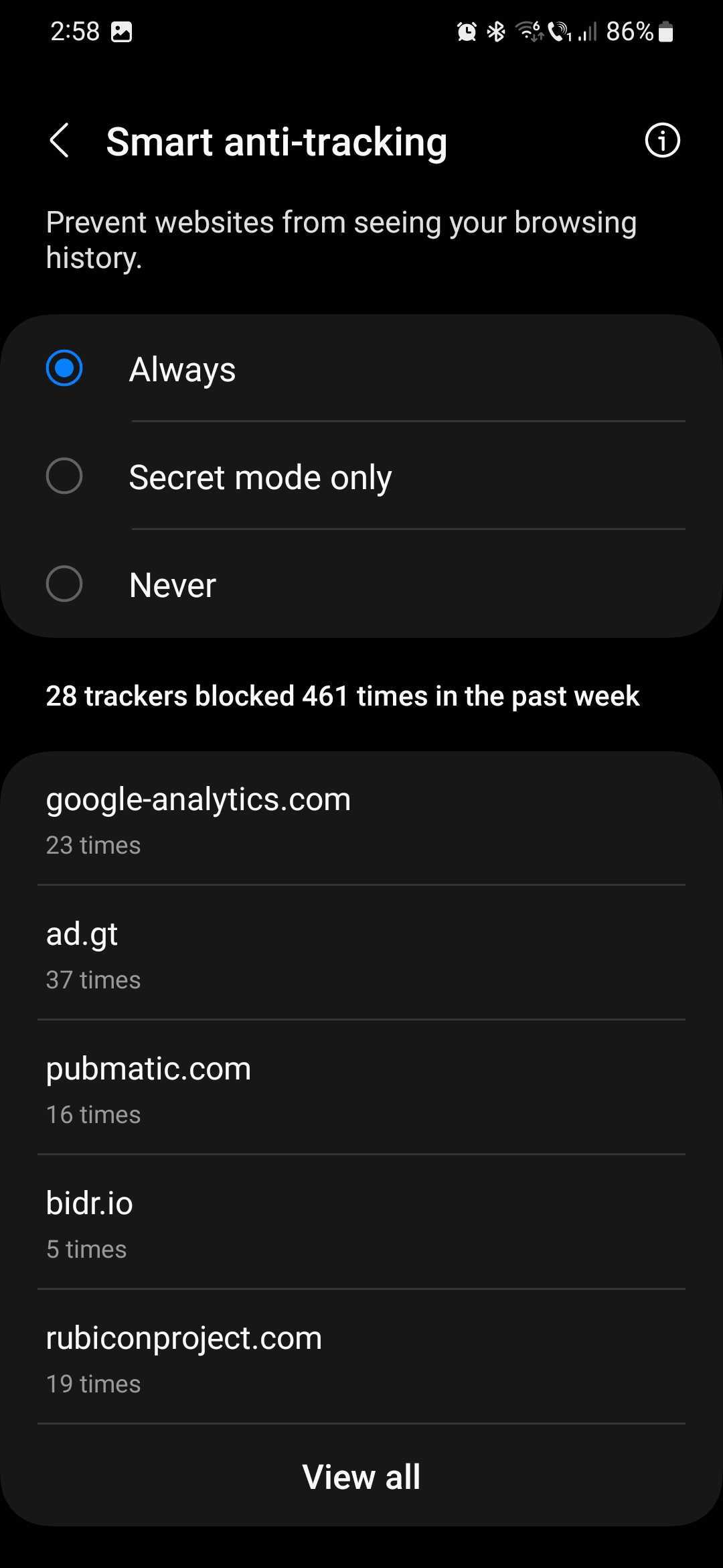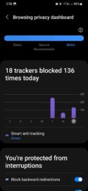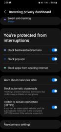 Samsung Internet comes pre-packaged with numerous privacy-centric tools, all of which can be accessed from the “browsing privacy dashboard.” Features include: