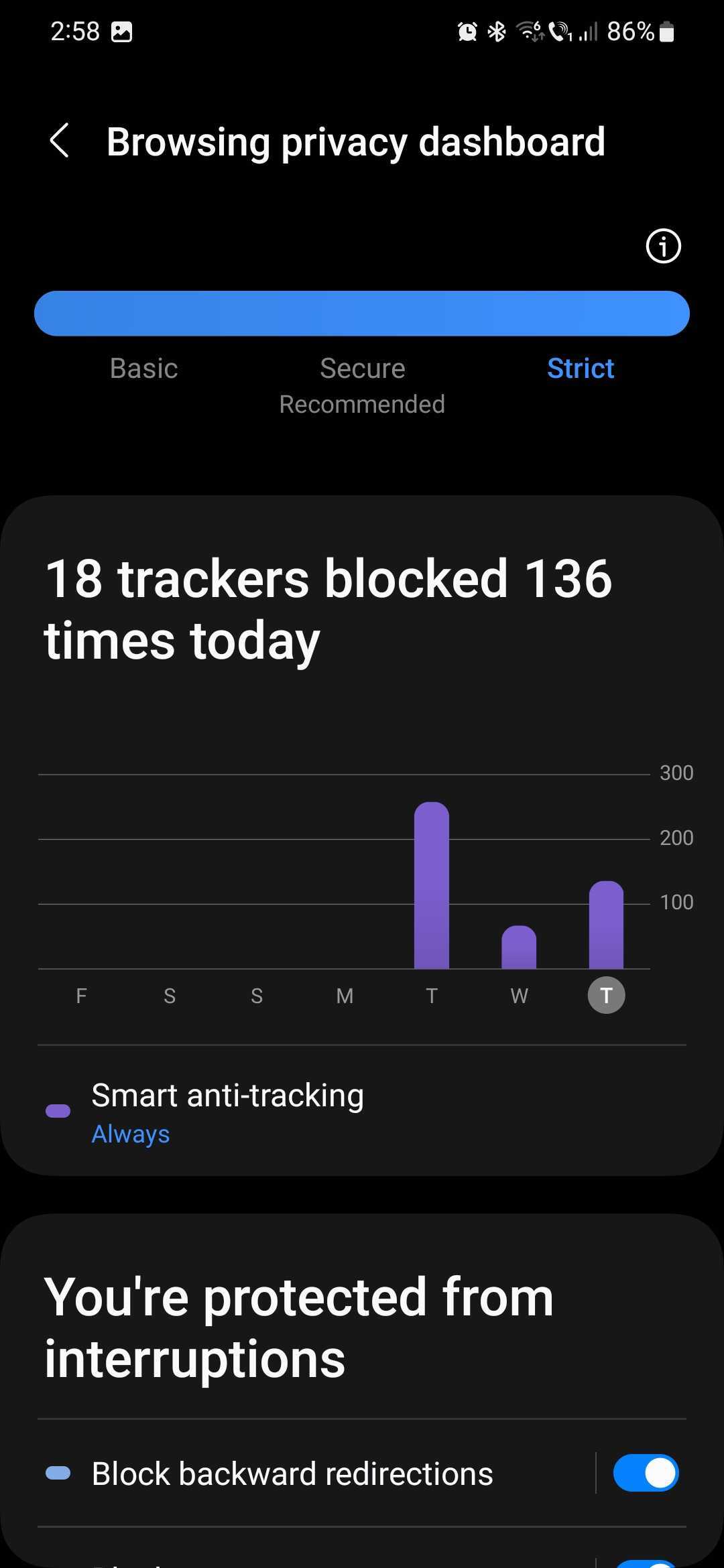 From the privacy dashboard, you can tap the toggles to enable or disable features. If you want more information, such as how many backward redirections or pop-ups Samsung Internet prevented, you can tap the name (not the ON/OFF toggle) of each privacy tool for a detailed overview.