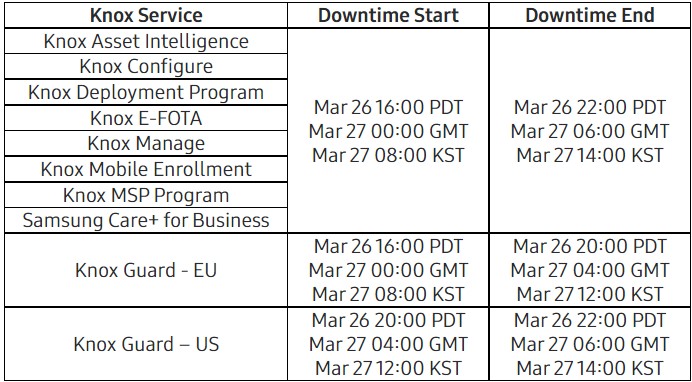 According to the official announcement, the Samsung Knox Cloud services downtime is scheduled for later this month, i.e., on Saturday, Mar 26, 2022 at 16:00 PDT, Sunday, Mar 27, 2022 at 00:00 GMT, and Sunday, Mar 27, 2022 at 08:00 KST.