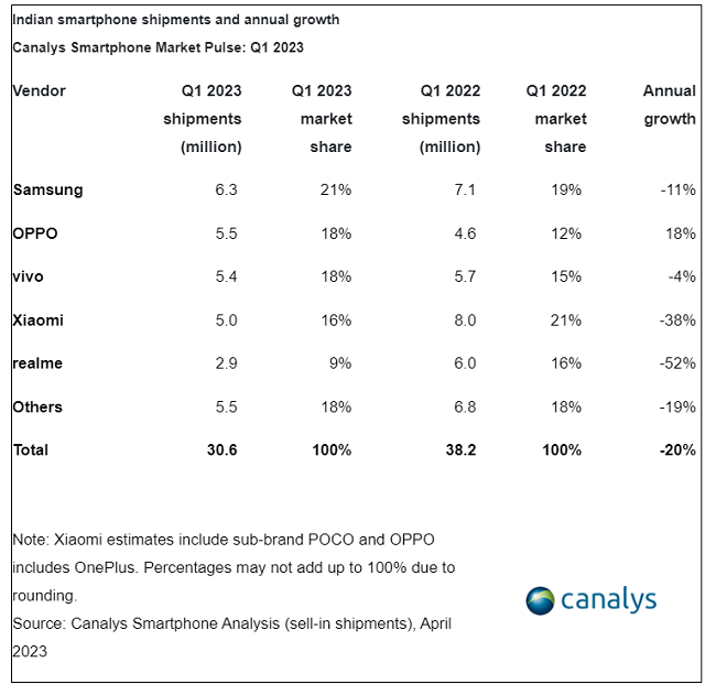 Realme fell even harder, selling 2.9 million smartphone units in Q1 2023. That's a massive 52% drop in shipments compared to Q1 2022. Note that OPPO's shipments include OnePlus business and Xiaomi's shipments include POCO business.