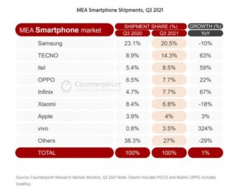 The MEA smartphone market had the best Q3 on record. The market grew 1% year-on-year and an impressive 7.5% quarter-on-quarter. Counterpoint Research estimates that a total of 46.5 million smartphones were shipped to MEA in Q3.