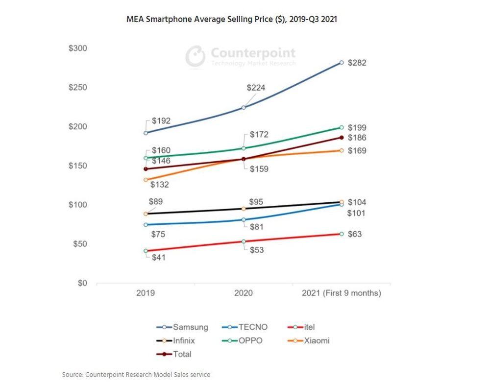 Of note is that the average selling price for smartphones in the MEA region has steadily increased over the past couple of years, and Samsung's phones saw the steepest climb, from an average price of $192 two years ago to $282 in Q3 2021.