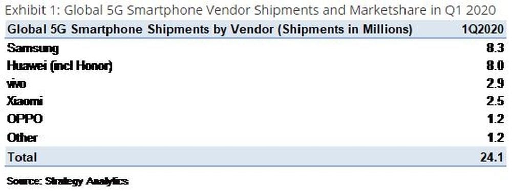 Samsung sits in the lead in terms of 5G smartphone shipments and it's closely followed by Huawei with 8 million units shipped. Out of 24.1 million 5G phones shipped in the first quarter of the year, 8.3 million were Samsung's. Popular 5G models include the Galaxy S20 5G and S20 Ultra 5G.