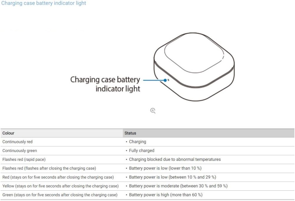 The user manual also contains basic sketches and information about the charging case, particularly the LED indicator and how it relays information about battery charge. For example, a solid red LED indicates that the case is charging, while a rapidly-blinking red LED suggests that charging was blocked due to abnormal temperatures. Unsurprisingly, the charging case has complementary built-in safety measures.